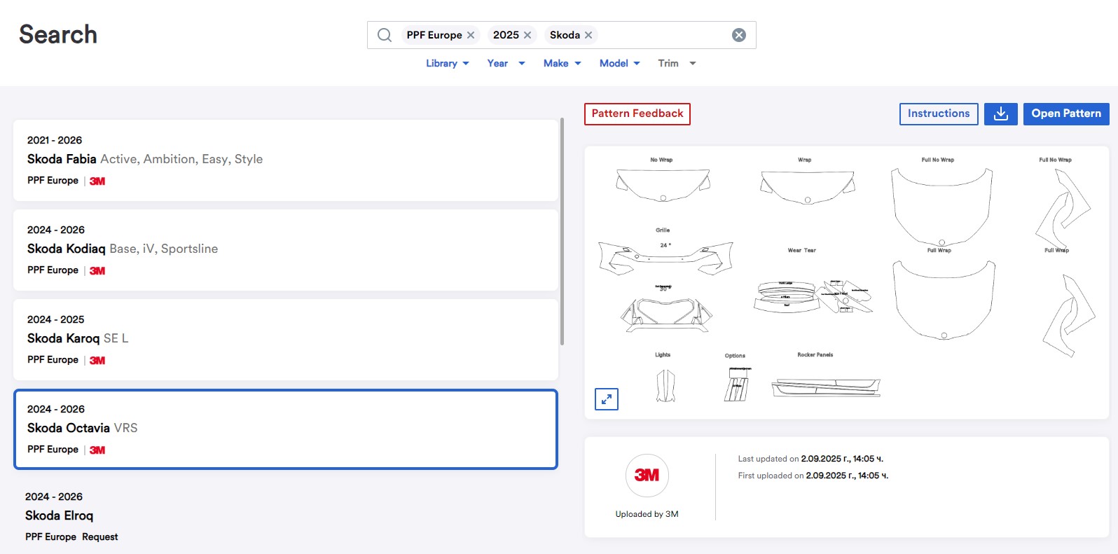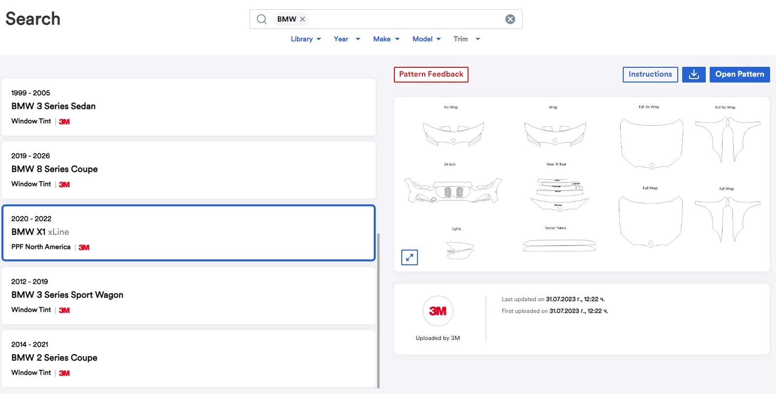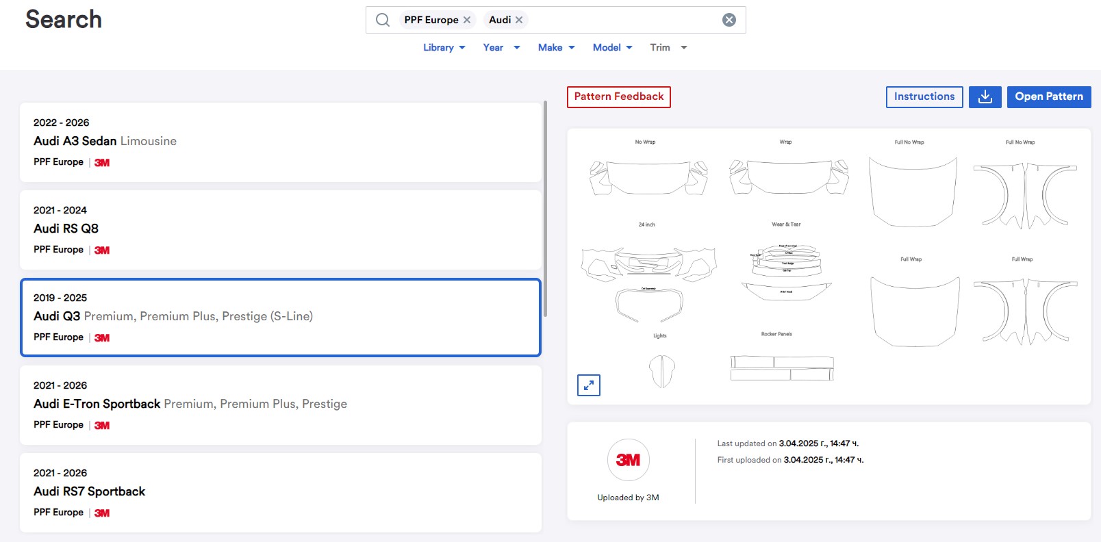 3M Pattern Marketplace е софтуер с над 5 500 модела европейски автомобили, който ви позволява бързо и лесно да получите точните размери на всяка част от автомобила за облепяне с фолио.