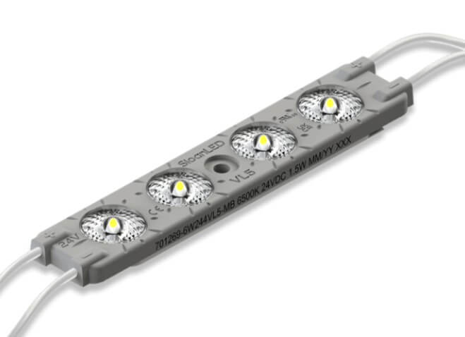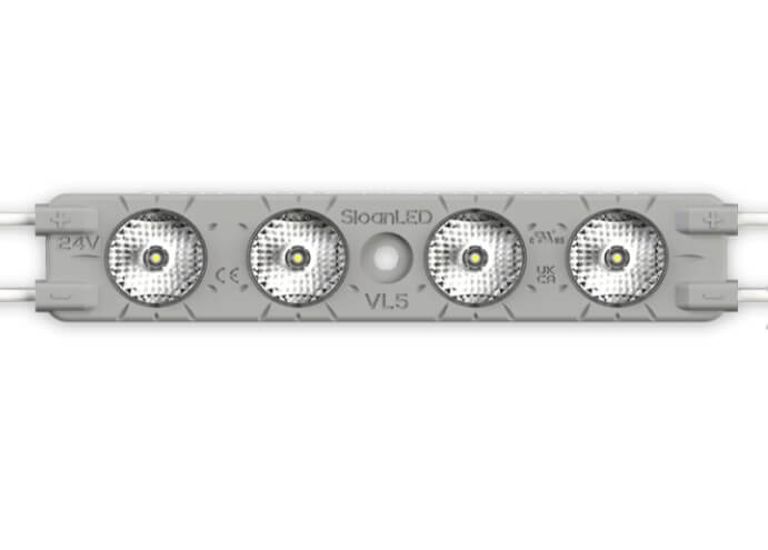 VL5 HO 24V (High Output) е мощно LED решение от ново поколение, създадено за осветяване на големи обемни букви с дълбочина от 125 до 305 мм и повече. Благодарение на усъвършенстваната призматична леща, модулът осигурява изключително широка зона на осветяване и впечатляваща сила на светлината, което го прави най-мощния представител в серията VL5.