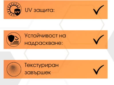 Solar Screen Cover Styl’ фолио за декорация покрива необходимите стандартите за качество. Характеризира се и с пожароустойчивост, за да гарантира безопасността на апликираните помещения. Мебелното фолио е и UV устойчиво. Има антибактериални свойства и се почиства и поддържа изключително лесно.
