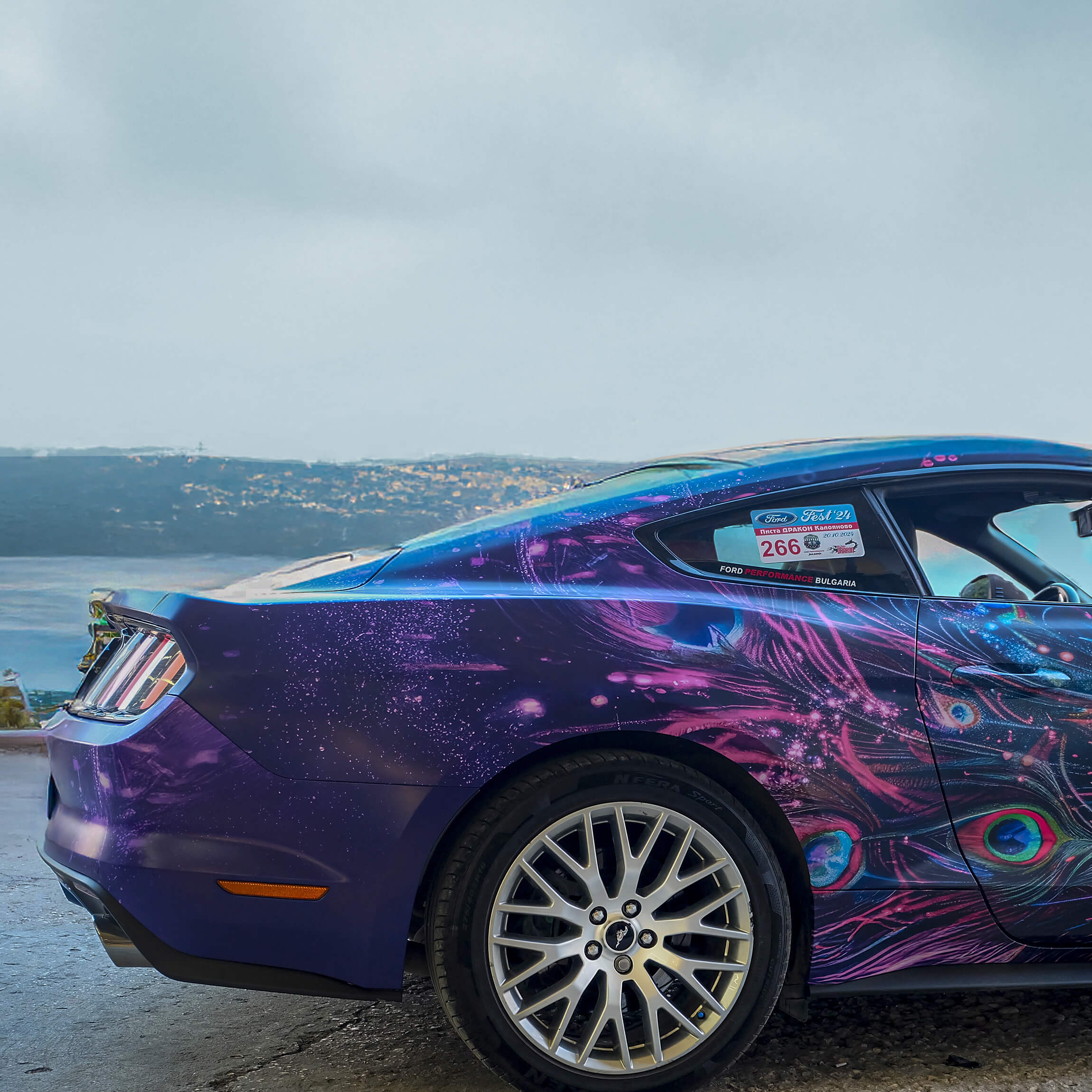 Централният елемент в дизайна е паун, разположен върху предния капак. Разперените пера преминават плавно по калниците и вратите, като създават усещане за движение и дълбочина. Дизайнът е разработен така, че да следва линиите на автомобила, без да ги скрива. Напротив – формите на каросерията работят заедно със графиката, което прави визията едновременно динамична и хармонична.